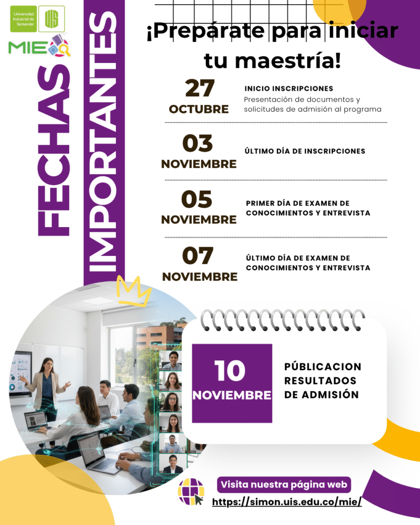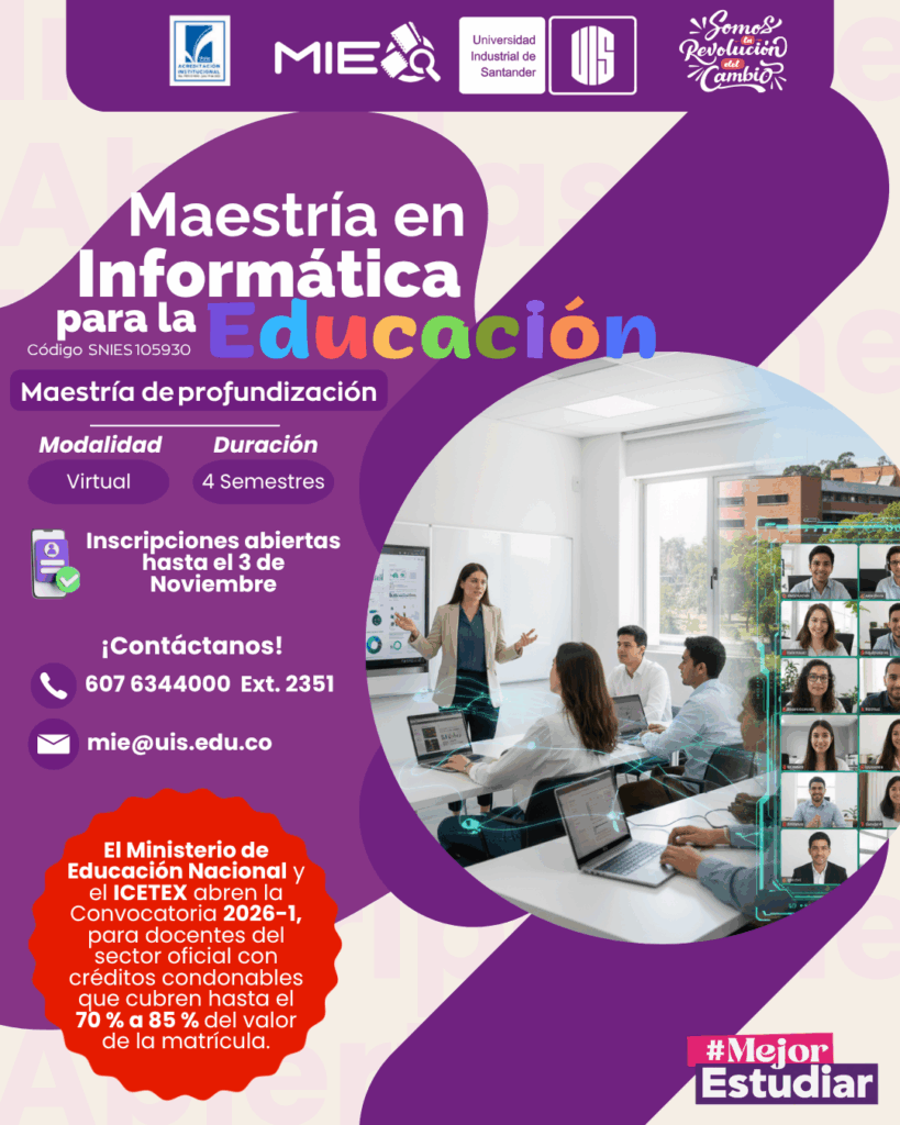 ¡Qué estás esperando! La Maestría en Informática para la Educación es modalidad VIRTUAL y es un posgrado dirigido a docentes de educación pre-escolar, básica y media y otros profesionales interesados en formarse como docentes investigadores con capacidad para indagar, reflexionar y actuar en su contexto educativo, incorporando de forma apropiada los recursos informáticos disponibles. En la Maestría en Informática para la Educación de la UIS brindamos a nuestros estudiantes formación integral de la más alta calidad. Recuerda que puedes presentarte en hasta el 3 de noviembre de 2025.