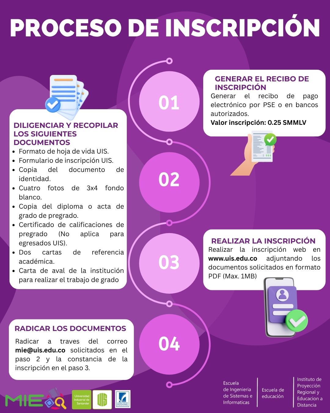 Inscripción en línea: A continuación, se presentan los formatos, los cuales deben estar en PDF con un tamaño inferior a 1Mb. Estos documentos deben ser enviados, por separado, a la siguiente dirección de correo mie@uis.edu.co