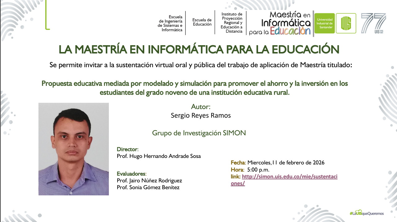 Estimada Comunidad universitaria, reciba un cordial saludo. La Maestría en Informática para la Educación de la Universidad Industrial de Santander se permite invitarlos a las sustentaciones públicas de las propuestas de investigación y sustentaciones de trabajos de grado. A continuación, encontrará las invitaciones y el vínculo de ingreso a la sustentación.